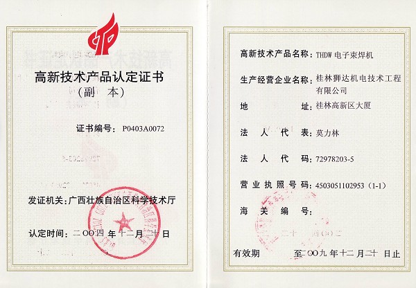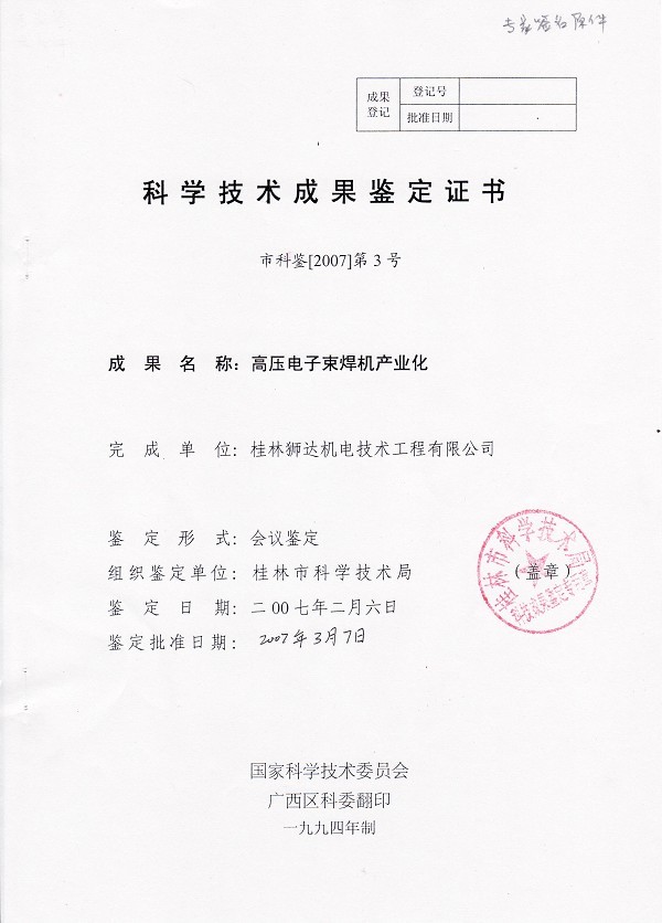 高壓電子束焊機(jī)產(chǎn)業(yè)化成果證書